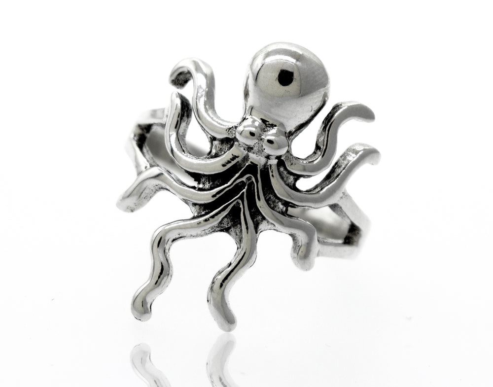 A high polish Super Silver sterling silver octopus ring on a white background.