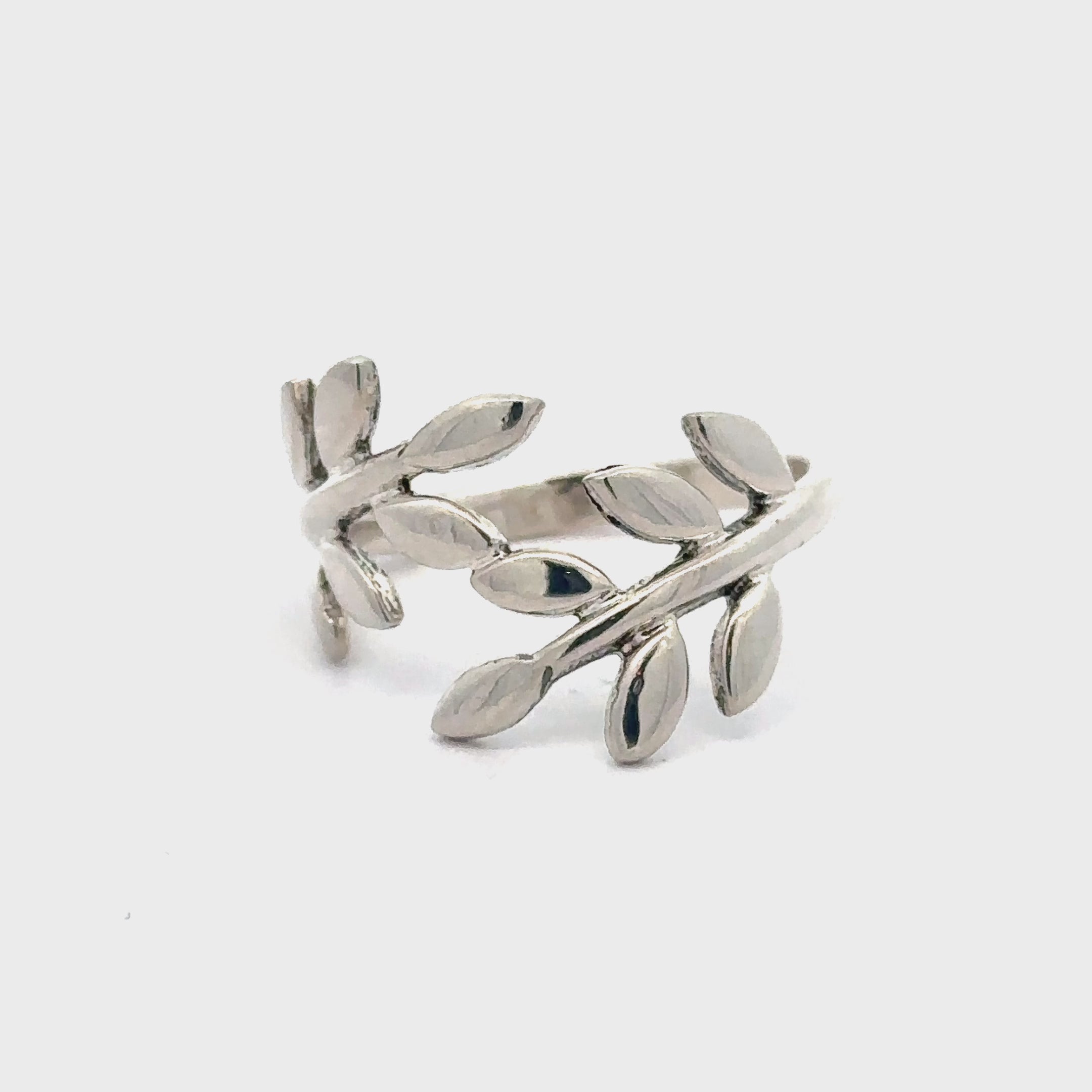 A silver ring in the shape of two olive branches coming together. As the Olive Branch is the symbol of peace, unity, and abundance, this ring will bring happiness to you and/or your loved ones.