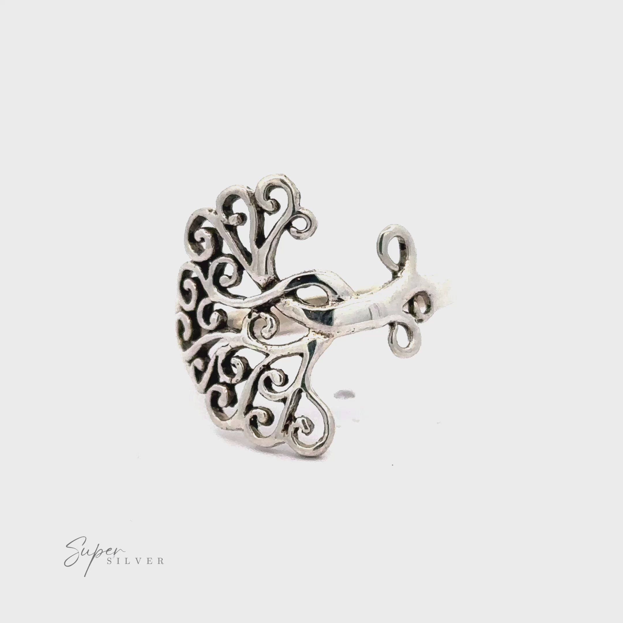 A sterling silver tree ring with swirls for branches.