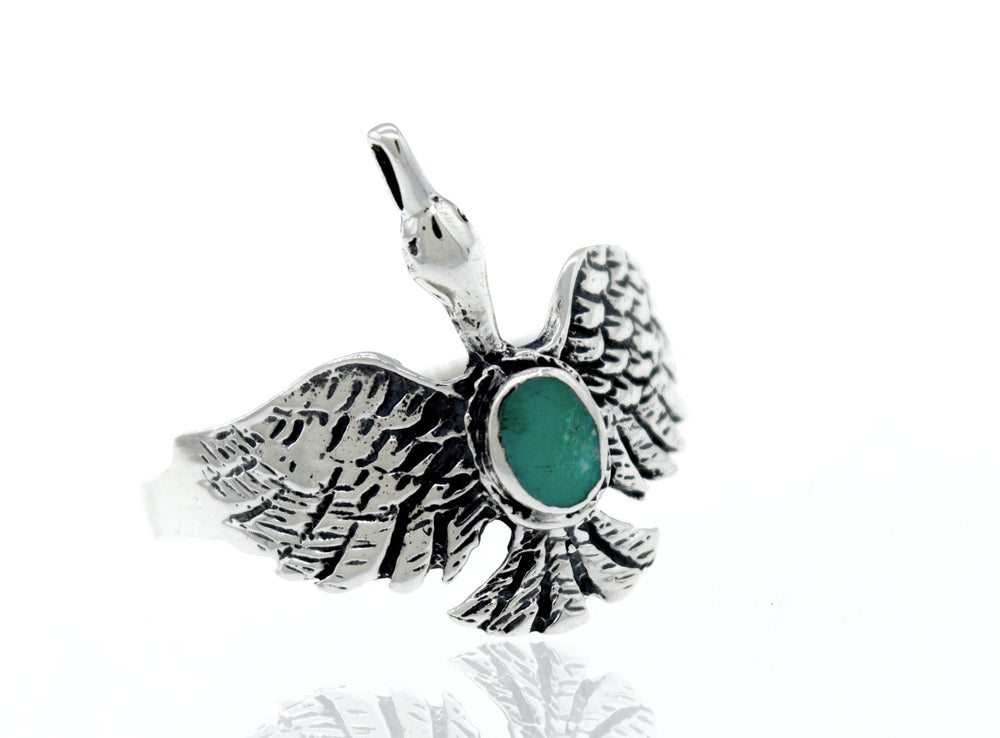 Beautiful sterling silver swan design ring with an oval stone in the center. The detailed feathers on the wings and the inlaid stone create a beautiful expression of love for nature perfect for any wildlife lover.