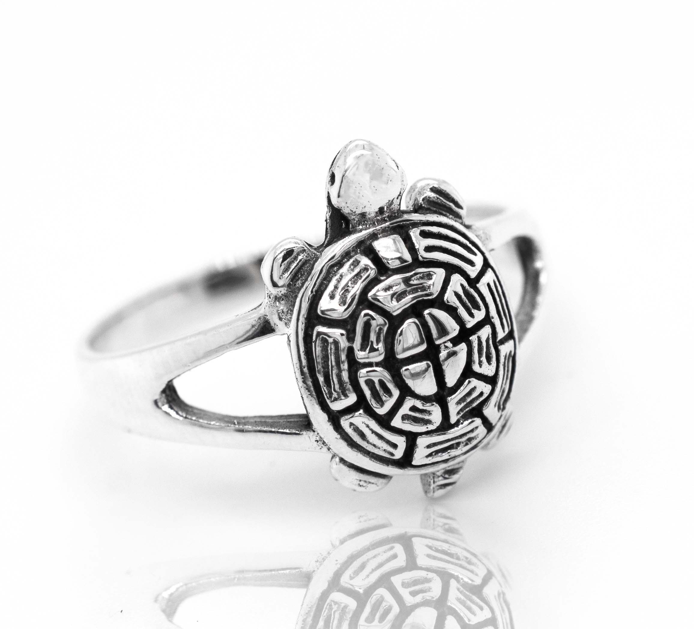 A perfect addition to your ocean-theme collection!! This beautiful sterling silver ring has a turtle-shaped design and a split shank band that fits your finger just right.