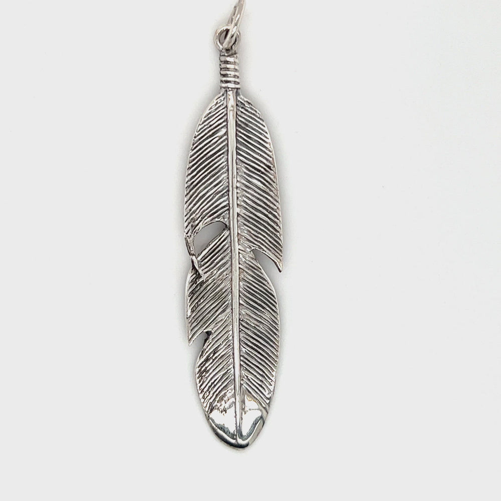 A stunning feather pendant adorned in a rustic silver design with fine detailing. The feather symbolizes truth, freedom, wisdom, and high honor, an appealing design for the free-spirited. Wear this impressive symbol draped with other southwest style necklaces, or wear it as a statement pendant for a chic look.